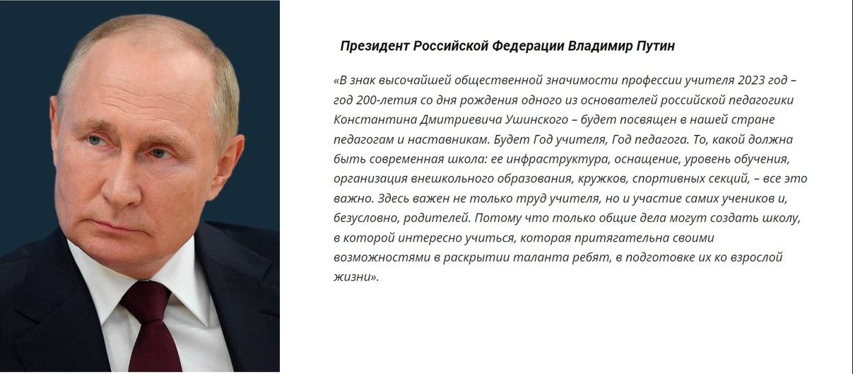 2023 год Указом Президента РФ от 27.06.2022г. №401 Владимира Путина объявлен Годом педагога и наставника.