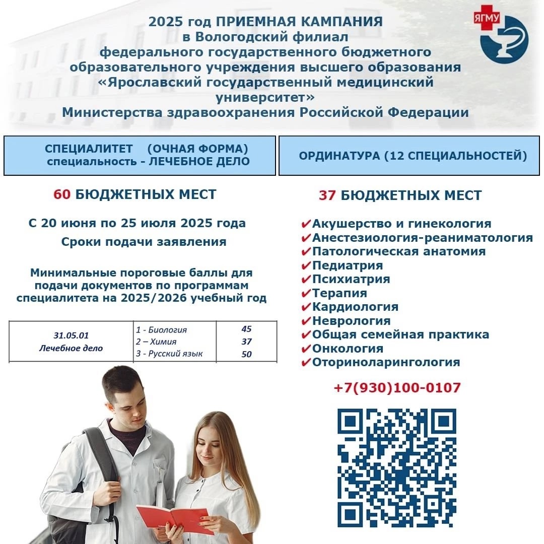 Вологодский филиал Ярославского государственного медицинского университета ведет набор на специалитет и в ординатуру.